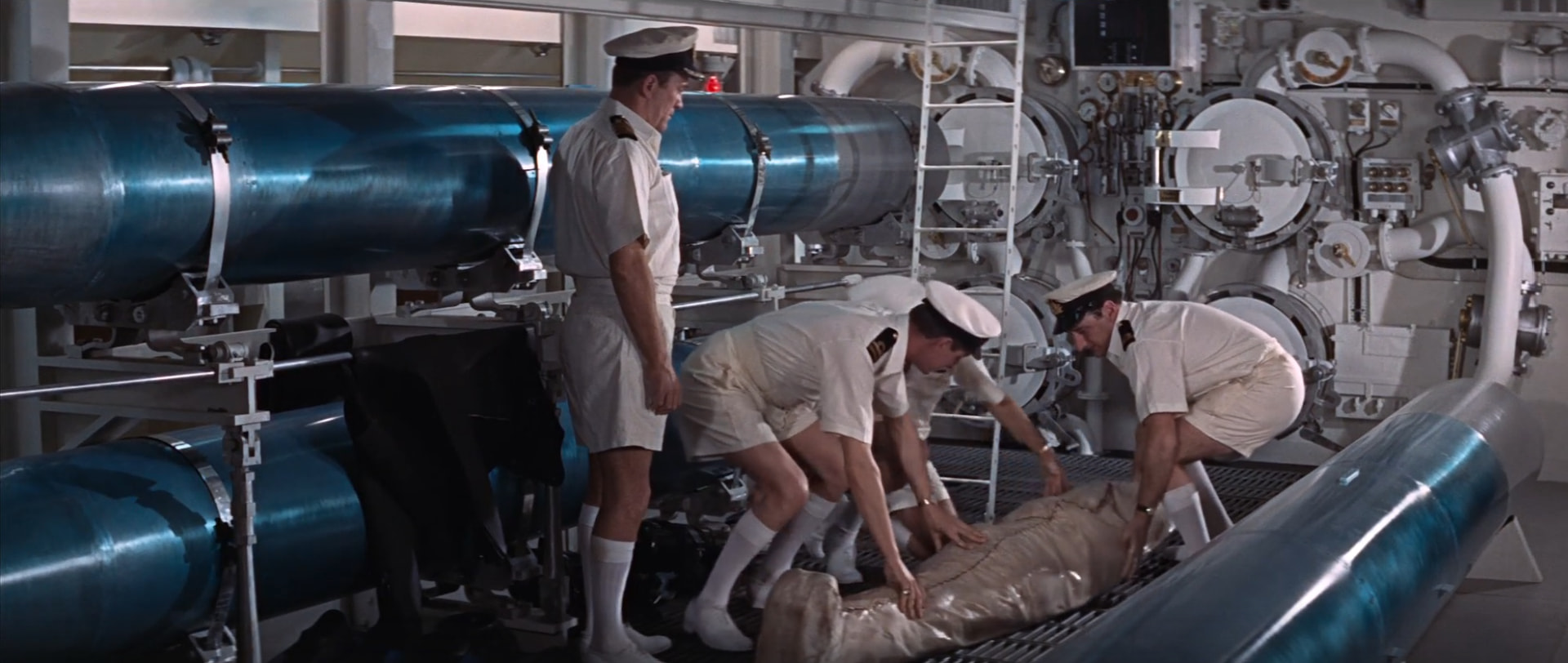 Wir sind noch ratlos. Es scheint aufgrund des Settings in einem U-Boot zu spielen und als würde eine Leiche ins Meer gefeuert werden sollen. Wir haben kurz an Mission: Rohrfrei gedacht, aber können uns an die Szene nicht erinnern.